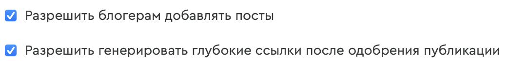 Флаг Разрешить блогерам добавлять посты - включить, если нужно дать возможность блогерам добавлять посты в проекте самостоятельно, даже при работе с менеджером Флаг Разрешить генерировать глубокие ссылки после одобрения публикации - включить, если нужно дать блогерам возможность добавлять доп. глубокие ссылки уже после одобрения публикации.